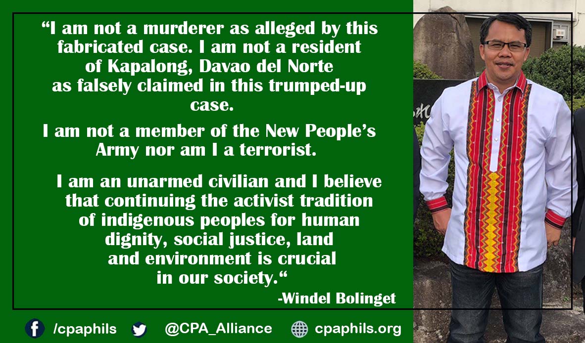 A trumped-up case of murder against Cordillera Peoples Alliance (CPA) Chairperson, Mr. Windel Bolinget, was filed by a police officer in a court in Tagum City, Davao Del Norte, Philippines in 2020. The Cordillera Peoples Alliance has learned that a warrant of arrest has been issued against Bolinget in relation to the case.