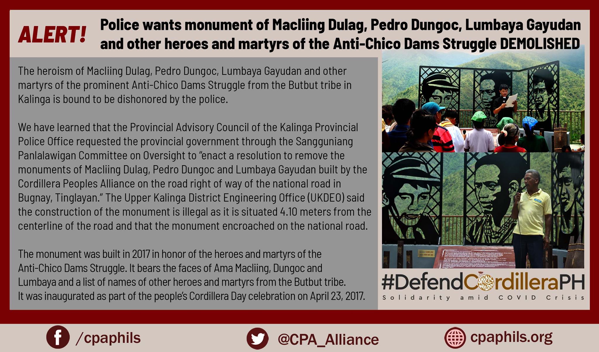 We have learned that the Provincial Advisory Council of the Kalinga Provincial Police Office requested the provincial government through the Sangguniang Panlalawigan Committee on Oversight to “enact a resolution to remove the monuments of Macliing Dulag, Pedro Dungoc and Lumbaya Gayudan built by the Cordillera Peoples Alliance on the road right of way of the national road in Bugnay, Tinglayan.” The Upper Kalinga District Engineering Office (UKDEO) said the construction of the monument is illegal as it is situated 4.10 meters from the centerline of the road and that the monument encroached on the national road.