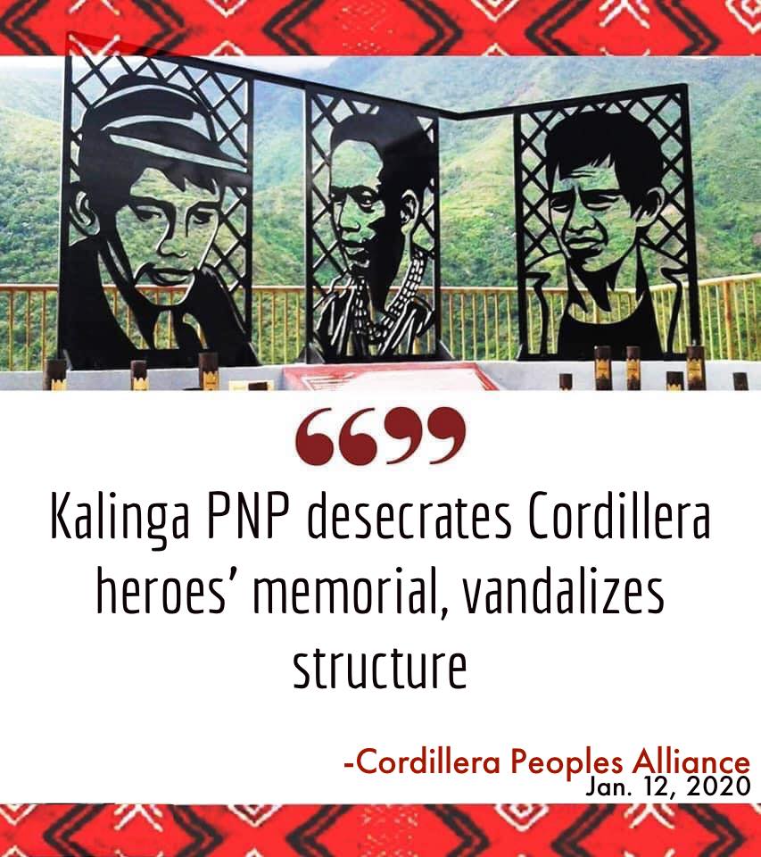 We vehemently condemn the dastardly act of the Kalinga Philippine National Police forces who desecrated the monument of our Cordillera heroes in Bugnay, Tinglayan, Kalinga province.